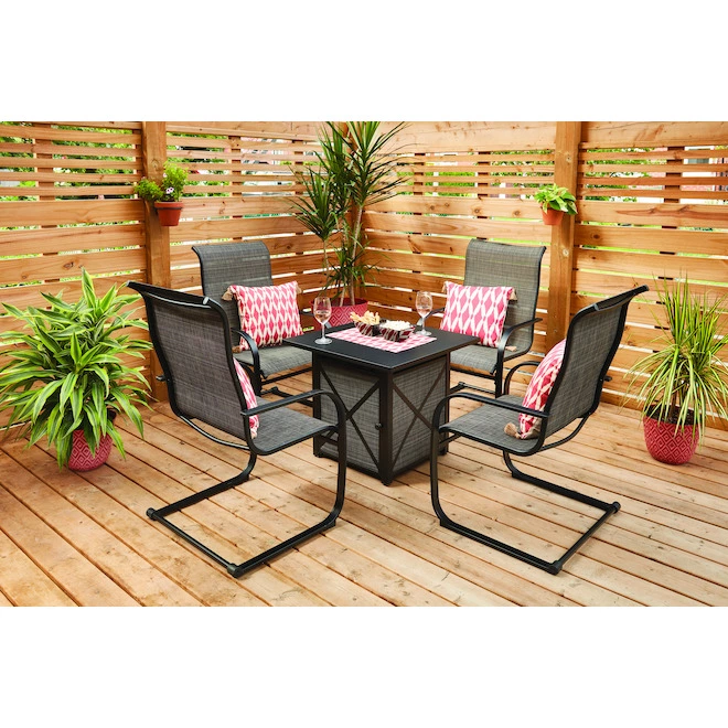 Create the perfect place to entertainment outside with this Hartford 5-piece patio set by Style Selections. Made of steel, it includes four chairs with fast-drying sling fabric and a gas fire table. The fireplace has a thermocouple safety feature that shuts off the gas flow if the flame goes out and also includes decorative lava rocks and a PVC protective cover. The gas tank is sold separately.