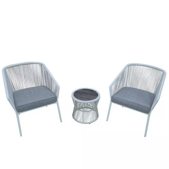 This patio bistro set presents a Cane weave style, all-weather wicker with grey cushion, wood-look tabletop. The matte black finish steel frame is powder-coated. This set is easy to assemble.