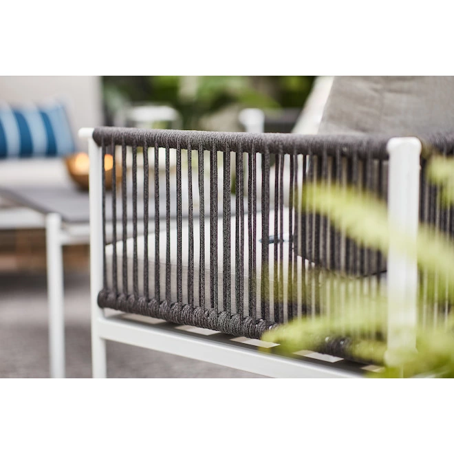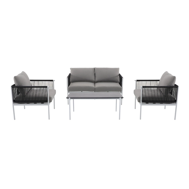 Enjoy your outdoor area with this breezy 4-piece conversation set. All-weather powder coated steel frame is complemented by updated rope details and the stone-look resin tabletop adds both style and functionality. The set includes 2 chairs, 1 love seat, and 1 coffee table.