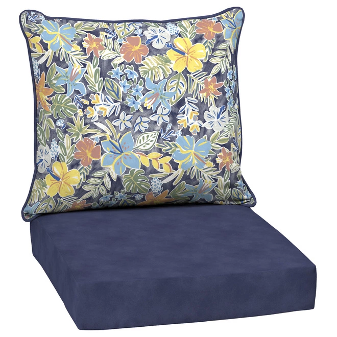 Designed to fit most deep-seat patio chairs, these Style Selections cushions are made of fade and weather-resistant polyester fabric and are filled with everLUXEĀ®, a superior poly fill that helps the cushions retain their shape. Reversible floral backrest cushion with a blue seat cushion.