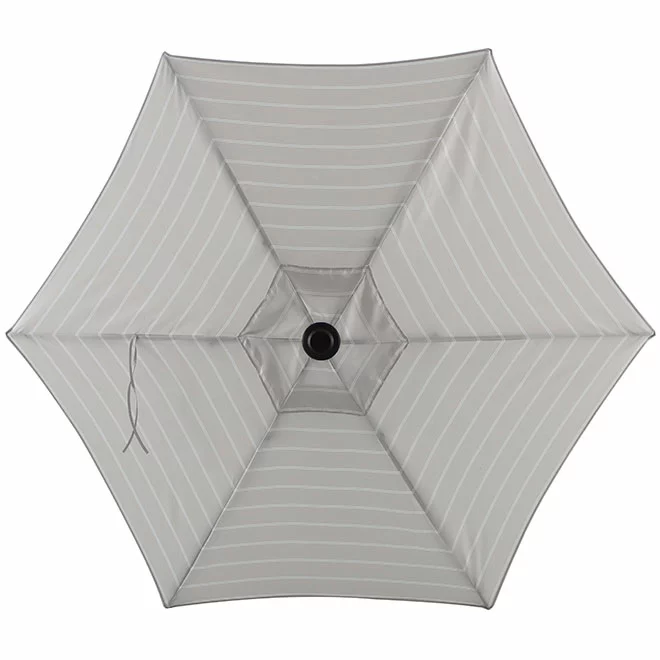 This 7.5-ft Patio Market Umbrella is ideal for providing protection from the sun and perfectly suited to small space dining sets and bistro sets. It features UV protected polyester fabric canopy in a versatile stripe design. It is made of rust resistant powder coated steel construction, offers a push-button tilt function to block the sun any time of the day and an easy hand crank and push-button tilt functionality.