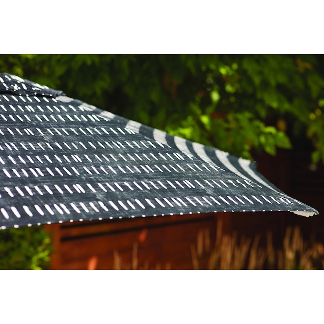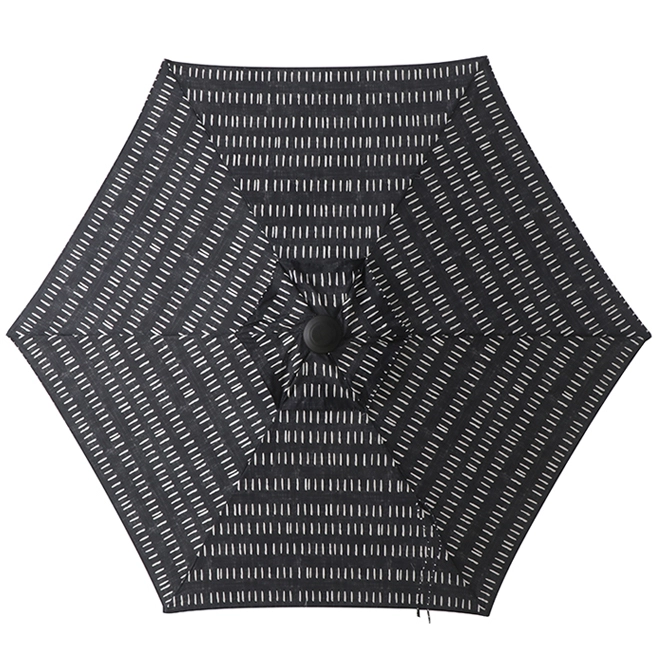 This 7.5-ft. patio umbrella by Style Selections provides over 44 square feet of shade and is ideal for outdoor bistro sets and smaller patio tables that require efficient sun protection. Its rust-resistant steel frame ensures long-lasting use and is designed to stand up against the elements. Convenient hook and loop tabs on the end of each rib make hanging additional lights or decorations simple and easy. This black model features little white stripes.